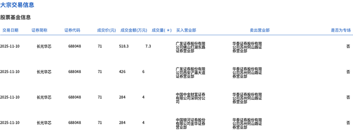 | 交易日期 | 证券简称 | 证券代码 | | | 成交价(元) 成交金额(万元) 成交量(*) 买入营业部 | | | 类出营业部 | 是否为专场 | | --- | --- | --- | --- | --- | --- | --- | --- | --- | --- | | 2025-11-10 | 长光华艺 | 688048 | 71 | 518.3 | 7.3 | SPATERS | 茶童茶茶帽出菜屋 | | 彩 | | 2025-11-10 | 长光华容 | 688048 | 71 | 426 | 6 | 全面積多重 | | 背出意图 | Ka | | 2025-11-10 | 长光华芯 | 688048 | 71 | 284 | 4 | 我國生言學生學 | 美香男篮露出版 | | 188 | | 2025-11-10 | 长光华艺 | 688048 | 71 | 284 | 4 | 是首容到要在高效 | Company of American Comments | | Ka | 11月10日,长光华芯大宗交易成交21.3万股,成交额1512.3万元,占当日总成交额的1.02%,成交价71 元, ...