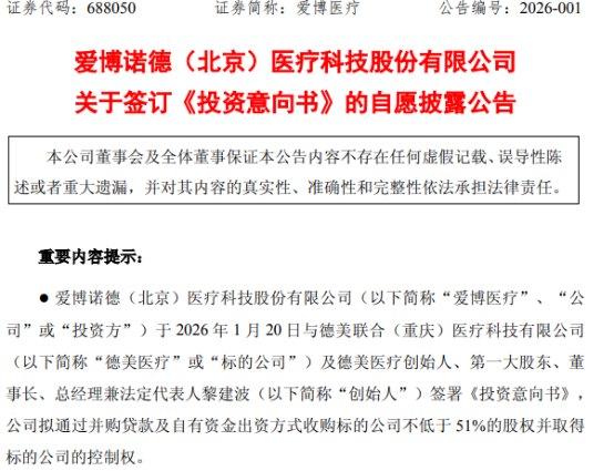 截至2026年1月21日收盘,爱博医疗(688050)报收于62.4元,较前一交易日上涨0.78%,最新总市值为 120.68亿元。该股当日开盘63.3元,最高63.82元,最低62.01元,成交额达3亿元,换手率为2.46%。 《688050爱博医疗 关于签订《投资意向书》的自愿披露公告》 以上内容为证券之星据公开信息整理,由AI算法生成(网信算备310104345710301240019号),不构成 投资建议。 公司近日发布公告称,爱博诺德(北京)医疗科技股份有限公司于2026年1月20日与德美联合(重庆) 医疗科技有限公司及其创始人黎建波签署《投资意向书》,拟通过并购贷款及自有资金收购德美医疗不 低于51%的股权,取得其控制权。德美医疗为国内运动医学领域头部企业,属国家高新技术企业及"专 精特新"小巨人企业,拥有276项专利,产品覆盖术前预防、手术治疗及术后康复全链条,已入选国家高 值医用耗材集采A组。本次交易尚需完成尽职调查、正式协议签署及内部审批程序,目前仅为初步意 向,除保密、排他期等条款外不具备法律约束力。 最新公告列表 ...