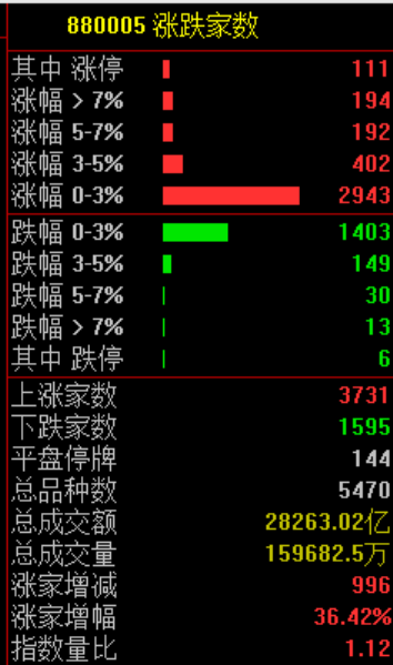 上天天基金APP搜索777注册即可领500元券包,优选基金10元起投!限量发放!先到先得! 大家好,今天的市场显然放缓了脚步,三大指数下跌,所幸的是,个股方面涨多跌少! A股调整 1月8日,沪指全天窄幅震荡,创业板指跌近1%。截至收盘, 沪指跌0.07%,深成指跌 0.51%,创业板指跌0.82%。 市场共 3731只个股上涨,111只个股涨停,1595只个股下跌。 | 880005 涨跌家数 | | | | --- | --- | --- | | 其中 涨停 | | 111 | | 涨幅 | > 7% | 194 | | 涨幅 | 5-7% | 192 | | 涨幅 | 3-5% | 402 | | 涨幅 | 0-3% | 2943 | | 跌幅 | 0-3% | 1403 | | 跌幅 | 3-5% | 149 | | 跌幅 | 5-7% | 30 | | 跌幅 | > 7% | 13 | | 其中 跌停 | | 6 | | | | 3731 | | | | 1595 | | 上涨停 新葡萄 | | 144 | | | | 5470 | | | | 28263.02亿 | | | | 159682.5万 ...