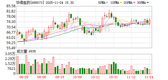 11月24日,毕得医药盘中上涨2.11%,截至13:08,报74.50元/股,成交2836.38万元,换手率0.90%,总 市值67.71亿元。 截至9月30日,毕得医药股东户数3493.00,较上期减少7.64%;人均流通股12377股,较上期增加 8.27%。2025年1月-9月,毕得医药实现营业收入9.79亿元,同比增长20.67%;归母净利润1.20亿元,同 比增长42.79%。 分红方面,毕得医药A股上市后累计派现2.58亿元。 机构持仓方面,截止2025年9月30日,毕得医药十大流通股东中,中欧医疗健康混合A(003095)位居 第二大流通股东,持股445.32万股,相比上期增加20.07万股。中欧医疗创新股票A(006228)位居第四 大流通股东,持股202.22万股,为新进股东。易方达价值成长混合(110010)位居第六大流通股东,持 股90.00万股,为新进股东。工银医疗保健股票(000831)位居第八大流通股东,持股60.94万股,为新 进股东。交银医药创新股票A(004075)位居第九大流通股东,持股47.51万股,为新进股东。农银医疗 保健股票(000913)、广发鑫享混合A(0021 ...
