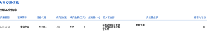 10月9日,金山办公大宗交易成交3万股,成交额927万元,占当日总成交额的0.21%,成交价309元,较 市场收盘价318.93元折价3.11%。 | 交易日期 | | 证券代码 > | 成交价(元) 成交金额(万元) 成交量(*) 买入营业部 | | | 卖出营业部 | 是否为专场 | | --- | --- | --- | --- | --- | --- | --- | --- | | 025-10-09 | 金山办公 | 688111 | 309 309 927 927 3 | 去需要和開始在發 | 机构专用 | | 190 | ...