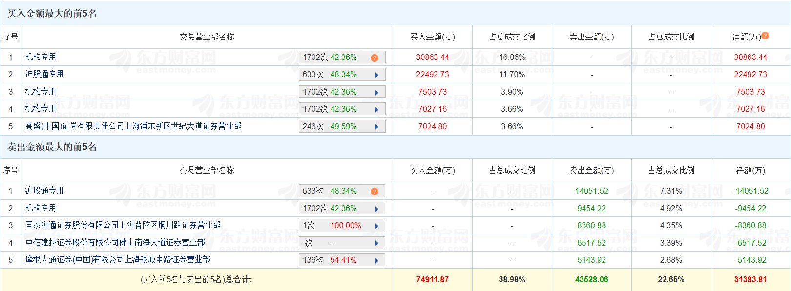 龙虎榜交易数据 - 机构专用席位买入金额最大,达30863.44万元,占总成交比例16.06% [1] - 沪股通专用席位买入22492.73万元,占总成交比例11.70% [1] - 机构专用席位净买入35940.12万元,显示机构资金大幅流入 [2] 买卖双方结构 - 买入前五名席位总计买入74911.87万元,占总成交比例38.98% [1] - 卖出前五名席位总计卖出43528.06万元,占总成交比例22.65% [1] - 净买入额为31383.81万元,反映资金整体呈流入态势 [1] 机构参与情况 - 买入金额最大的前五名中有3家机构专用席位 [2] - 卖出金额最大的前五名中有1家机构专用席位 [2] - 机构席位净买入金额为35940.12万元,凸显机构看好态度 [2]
