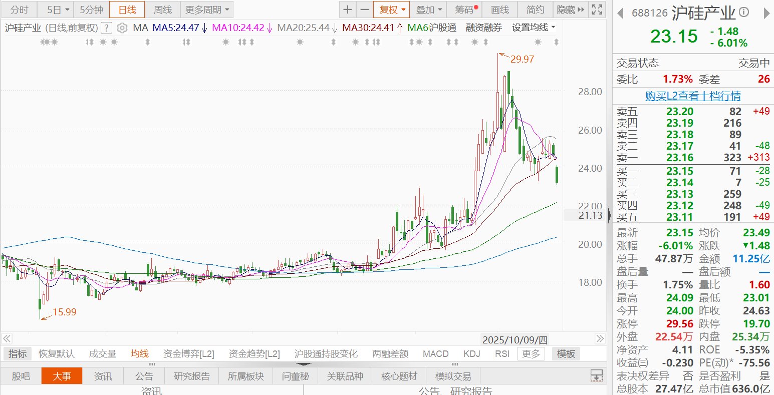 A股异动丨沪硅产业跌逾6%,前三季度净亏损6.31亿元