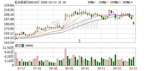 10月13日,石头科技大宗交易成交1.5万股,成交额240万元,占当日总成交额的0.21%,成交价160元, 较市场收盘价187.5元折价14.67%。 | 仅景垒立日心 | | | | | | | | --- | --- | --- | --- | --- | --- | --- | | 交易日期 | 证券简称 | 证券代码 | 成交价(元) 成交金额(万元) 成交量( *) 买入营业部 | | 卖出营业部 | 是否为专场 | | 025-10-13 | 石头科技 | 688169 | 160 240 不直接ຊຶມສຸຂອ | 1.5 | 我們是最嚴嚴 | 190 | ...