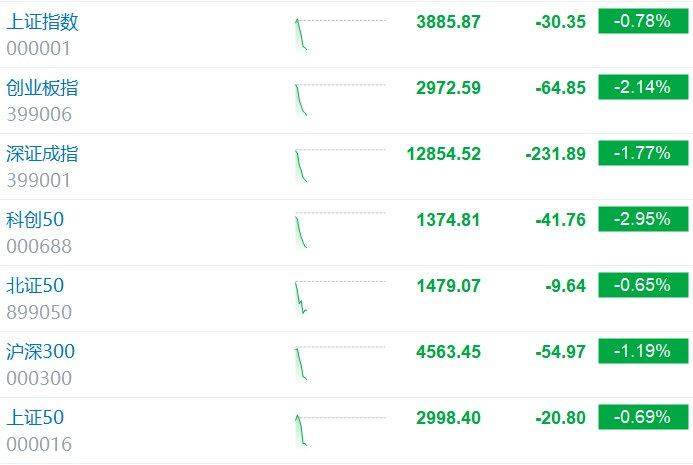 科创50指数表现 - 科创50指数收盘于1374.81点,单日下跌41.76点,跌幅达2.95% [1][2] - 指数成份股中阿特斯跌幅超过6%,生益电子和中微公司跌幅均超过4% [1] 主要股指表现 - 上证指数收盘于3885.87点,下跌30.35点,跌幅0.78% [2] - 深证成指收盘于12854.52点,下跌231.89点,跌幅1.77% [2] - 创业板指收盘于2972.59点,下跌64.85点,跌幅2.14% [2] - 沪深300指数收盘于4563.45点,下跌54.97点,跌幅1.19% [2] - 上证50指数收盘于2998.40点,下跌20.80点,跌幅0.69% [2] - 北证50指数收盘于1479.07点,下跌9.64点,跌幅0.65% [2]