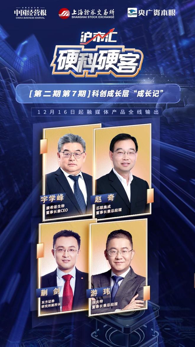 芯联集成董事长兼总经理赵奇、康希诺生物董事长兼CEO宇学峰、埃夫特董事长兼总经理游玮等上市前 未盈利企业代表,共探扭亏为盈"时间表"与"路线图"。 《沪市汇·硬科硬客》第二季第7期"科创成长层'成长记'"即将开播上线。 C 央广资本服 中国经营报 TE = 海 游 游 交 易 所 > S H ANGE FIZY [第二期第7期]科创成长层"成长记" 12月16日起融媒体产品全线输出 x 康希诺生物 芯联集成 重事长兼CEO 董事长兼总经理 4 用用! 东方证券 研究所副所 ...
