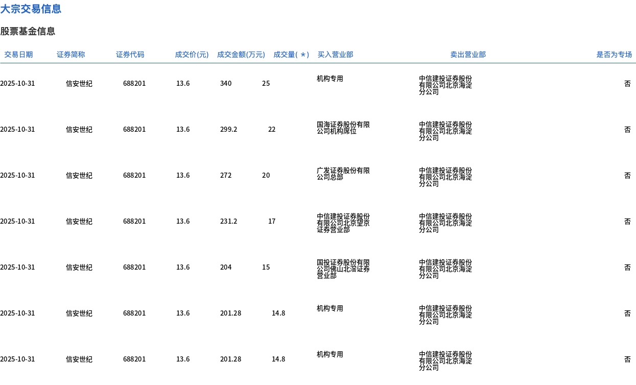 大宗交易概况 - 2025年10月31日,信安世纪发生大宗交易,成交128.6万股,成交总额为1748.96万元 [1] - 该笔大宗交易占公司当日总成交额的2.78% [1] - 成交价格为13.6元,较当日市场收盘价16.63元折价18.22% [1] 交易明细分析 - 大宗交易由多笔交易组成,单笔成交量在14.8万股至25万股之间,成交价均为13.6元 [2] - 买入方营业部包括机构专用席位、国海证券股份有限公司及厂发证券股份有限公司等 [2] - 部分交易记录显示卖出营业部信息缺失或存在乱码,表明数据可能存在不完整 [2]