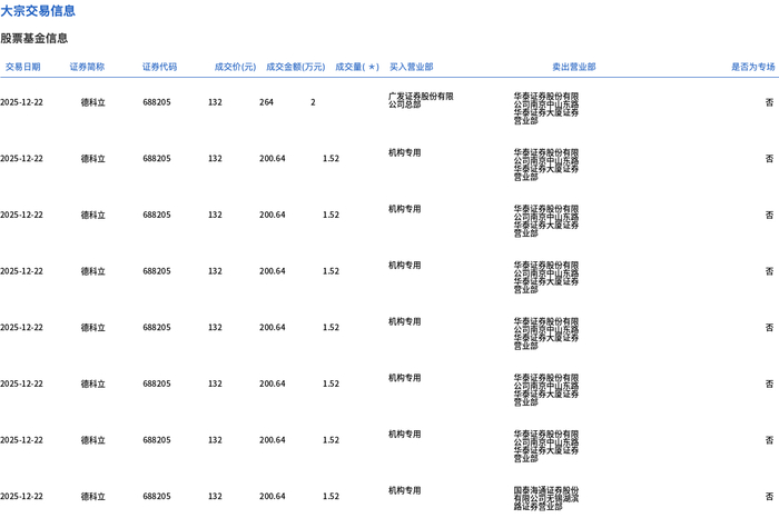 大宗交易概况 - 2025年12月22日,德科立(688205)发生大宗交易,总成交12.64万股,总成交额1668.48万元,占该股当日总成交额的0.82% [1] - 该笔大宗交易的成交价为132元,较当日市场收盘价154.11元折价14.35% [1] 交易明细分析 - 当日共发生8笔大宗交易,成交价均为132元 [2] - 其中一笔成交量为2万股,成交金额264万元,买入营业部为“公司党委员会并报” [2] - 其余7笔交易的成交量均为1.52万股,单笔成交金额均为200.64万元,买入营业部均为“机构专用” [2] - 卖出营业部信息在表格中显示不全,但可见部分涉及“公司高息中山”、“公司日室中山东莞”、“司间京中山”等 [2]