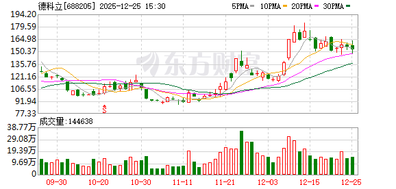 进一步统计,近3个月内该股累计发生53笔大宗交易,合计成交金额为2.17亿元。 证券时报·数据宝统计显示,德科立今日收盘价为152.80元,下跌1.81%,日换手率为9.14%,成交额为 22.23亿元,全天主力资金净流入3932.81万元,近5日该股累计下跌5.75%,近5日资金合计净流入3.67亿 元。 12月25日德科立大宗交易一览 德科立12月25日大宗交易平台出现一笔成交,成交量10.00万股,成交金额1320.00万元,大宗交易成交 价为132.00元,相对今日收盘价折价13.61%。该笔交易的买方营业部为机构专用,卖方营业部为国泰海 通证券股份有限公司无锡湖滨路证券营业部。 两融数据显示,该股最新融资余额为11.22亿元,近5日增加1.17亿元,增幅为11.66%。 据天眼查APP显示,无锡市德科立光电子技术股份有限公司成立于2000年01月31日,注册资本 15828.5329万人民币。(数据宝) | 成交量 | 成交金额 | 成交价格 | 相对当日收盘折溢 | 买方营 | 卖方营业部 | | --- | --- | --- | --- | --- | --- | | (万股) | (万元) ...