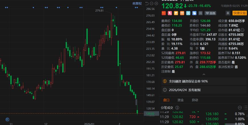 公司股价表现 - 2月25日股价再度大跌16.45%,跌幅居市场首位 [1] - 月内累计跌幅超过50% [1] - 股价一度跌破120元关口,总市值为81.6亿元 [1] 公司重大事项 - 公司决定终止一项重大资产重组交易,该交易原计划通过支付现金和发行股份方式购买南宁泰克70%和30%股权并募集配套资金 [1] - 终止原因为市场环境变化及交易双方未能就核心条款达成一致 [1] 公司财务业绩 - 公司发布2025年年度业绩预告,预计归母净利润为亏损800万元至1200万元 [1] - 业绩同比由盈转亏 [1] - 业绩预告发布后,公司股价连续下跌 [1]