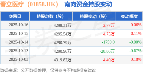 春立医疗(01858.HK):10月13日南向资金减持28.86万股