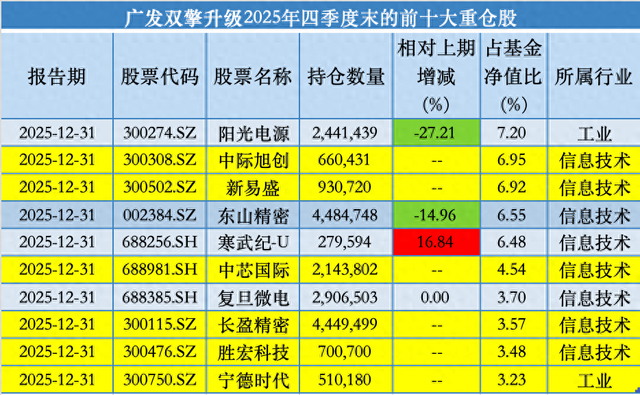 基金经理持仓变动 - 广发基金刘格菘在2025年四季度对其管理的广发双擎升级基金进行了调仓,前十大重仓股包括阳光电源、中际旭创、新易盛、东山精密、寒武纪、中芯国际、复旦微电、长盈精密、胜宏科技和宁德时代 [1][3] - 刘格菘管理的广发双擎升级基金在2025年四季度首次买入新易盛和长盈精密,同时中际旭创、中芯国际、胜宏科技、宁德时代新进持仓前十 [2] - 该基金在四季度增持了寒武纪,持仓数量增加16.84%至279,594股,占基金净值比6.48%;减持了东山精密(减持14.96%)和阳光电源(减持27.21%)[3] - 银华基金李晓星在管基金总规模为225.22亿元,其代表作银华中小盘精选在2025年四季度前十大重仓股为海光信息、兆易创新、晶合集成、华虹公司、北方华创、寒武纪、芯源微、安集科技、中航沈飞和沪电股份 [5][6] - 李晓星管理的银华中小盘精选在四季度首次买入寒武纪和安集科技,海光信息、兆易创新、北方华创等多只个股新进持仓前十;同时增持了晶合集成(增持15.74%)和华虹公司(增持22.70%)[5][6] - 该基金在四季度减仓了中航沈飞(减持3.63%)和沪电股份(减持32.29%),工业富联、生益科技、深南电路、东山精密、国睿科技、航天南湖退出持仓前十 [5] 行业观点与投资方向 - 刘格菘看好AI带来的基础设施、能源、电力、存储、算力、模型、应用等各个层面的需求,认为下游应用发展将提升行业估值空间 [4] - 刘格菘投资侧重景气行业中供给端受限的环节,如存储大周期、海外龙头供应链、国产算力以及储能和其上游材料等行业 [4] - 刘格菘认为海外模型token快速提升及AI应用在软件公司占比逐季提升,将推动存量应用公司效率升级和新应用诞生,从而提升需求空间并带来行业及公司利润的非线性增长 [4] - 李晓星认为AI仍是全球科技创新的主线,海外AI算力投入处于加速周期,供给端瓶颈环节将持续受益且业绩兑现度更高 [7] - 李晓星指出国产算力投资较海外滞后,国产算力卡供需缺口较大,供应链瓶颈在加速解决,后续增长更具爆发力;同时关注AI硬件端侧创新及AI应用投资机会 [7] - 李晓星看好国内先进制程突破带动的先进制程代工、先进封装、国产算力芯片的投资机会,认为国内头部存储原厂和逻辑晶圆厂扩产将拉动国产设备材料需求增长 [7] - 在国防军工方面,李晓星继续看好军贸方向,认为我国军贸全球份额与制造业能力不匹配,存在巨大提升空间;同时关注十五五规划下的商业航天、低空经济、深海科技等新质生产力投资机会 [7]