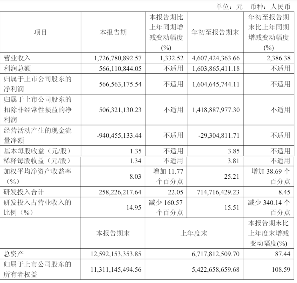 | | | | 里付: 元 | 市神:人民市 | | --- | --- | --- | --- | --- | | | | 本报告期比 | | 年初至报告期 | | 项目 | 本报告期 | 上年同期增 | 年初至报告期末 | 末比上年同期 | | | | 减变动幅度 | | 增减变动幅度 | | | | (%) | | (%) | | 营业收入 | 1,726,780,892.57 | 1,332.52 | 4,607,424,363.66 | 2.386.38 | | 利润息额 | 566,110,844.05 | 不适用 | 1,603,865,411.18 | 不适用 | | 归属于上市公司股东的 | 566,563,175.54 | 不适用 | 1,604,645,744.11 | 不适用 | | 净利润 | | | | | | 归属于上市公司股东的 扣除非经常性损益的净 | 506,321,130.23 | 不适用 | 1,418,887,977.30 | 不适用 | | 利润 | | | | | | 经营活动产生的现金流 | -940.455.133.44 | 不适用 | -29.304.811 ...