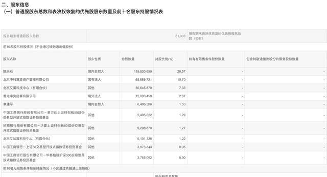 | 服药期末普通投股东总数 | | | 01,993 | 脂香弱完面减税值量的优先服股东值 | | --- | --- | --- | --- | --- | | | | | 建(恰有) | | | 防10名胶东腾股情况 (不含量过转破通出情股份) | | | | | | 股东名称 | 股东性质 | 持股效量 | 時設比例(%) 持有有限责条件股份数量 | 包含体融通知出险份的限量投资基 | | 陈天石 | 境内自然大 | 110,530,650 | 28.57 | = | | 北京中科第四百日 新疆有限公司 | 國有該人 | 65,669,721 | 15.70 | . | | 文京艾演科技中心(有限合伙) | 其他 | 30,645,870 | 7.33 | 1 | | 香港中央想算有限公司 | 境外法人 | 12.003.459 | 2.87 | - | | 章建宁 | 境内自然人 | 6,406,506 | 1.53 | 1 | | 中国工商银行股份有限公司=易为达上证科创板50模份 必要是并放式都量后的在新形中 | 其古 | 5,405,622 | 1.25 | 6 | | 招聘银行股份有限公司-本 ...