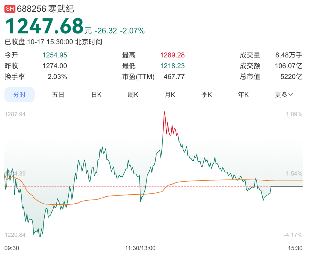 寒武纪(688256.SH)业绩发布。 10月17日,寒武纪发布2025年第三季度报告。财报显示,寒武纪第三季度营收为17.27亿元,同比增长1332.52%;净利润为5.67亿元。前三季度营收为 46.07亿元,同比增长2386.38%;净利润为16.05亿元。业绩变动主要原因是公司持续拓展市场,积极助力人工智能应用落地,使得报告期内收入较上年同 期大幅增长。 行情方面,截至10月17日收盘,寒武纪股价报1247.68元/股,总市值5220亿元。 | 今井 | 1254.95 | | 最高 | 1289.28 | | 成交量 | 8.48万手 | | --- | --- | --- | --- | --- | --- | --- | --- | | 昨收 | 1274.00 | | 最低 | 1218.23 | | 成交额 | 106.07亿 | | 换手率 | 2.03% | | 市盈(TTM) | 467.77 | | 总市值 | 5220亿 | | / \ Plant / V | r | 11 | -- | 111 | H | i | 1 | 资料显示,寒武纪成立于2016年,专注于人工智能芯片产品的 ...