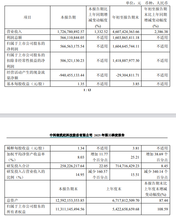 10月17日,寒武纪发布2025年第三季度报告。数据显示,2025年第三季度公司营收为17.27亿元,同比 增长1332.52%;归属于上市公司股东的净利润为5.67亿元。 | 稀释每股收益(元/股) | 1.34 | 不适用 | 3.81 | 不适用 | | --- | --- | --- | --- | --- | | 加权平均净资产收益率 | 8.03 | 增加 11.77 | 25.21 | 增加 38.69 个 | | (%) | | 个百分点 | | 百分点 | | 研发投入合计 | 258.226.217.64 | 22.05 | 714.716.429.23 | 8.45 | | 研发投入占营业收入的 | 14.95 | 减少 160.57 | 15.51 | 减少 340.14 个 | | 比例(%) | | 个百分点 | | 百分点 本报告期末比 | | | 本报告期末 | | 上年度末 | 上年度末增减 | | | | | | 变动幅度(%) | | 总资产 | 12.592.153.353.85 | | 6,717,812,509.70 | 87.44 | | 归属于上市公司股东的 | ...