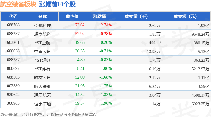 航空装备板块市场表现 - 10月17日航空装备板块整体下跌3.56%,领跌个股为航宇科技,跌幅达9.37% [1][2] - 当日上证指数下跌1.95%至3839.76点,深证成指下跌3.04%至12688.94点 [1] - 板块内个股普遍下跌,跌幅居前的包括华秦科技(-7.44%)、航亚科技(-6.95%)、派克新材(-5.52%)等 [2] 个股交易情况 - 佳驰科技为板块内少数上涨个股,涨幅2.74%,收盘价73.62元,成交额1.93亿元 [1] - 超卓航科微涨0.28%,收盘价52.92元,成交额9648.24万元 [1] - 成交量较大的个股包括晨曦航空(22.71万手)、海特高新(26.39万手)、西部超导(25.66万手) [2] 板块资金流向 - 当日航空装备板块主力资金净流出22.36亿元,游资资金净流入4.59亿元,散户资金净流入17.77亿元 [2] - 迈信林主力净流入1704.22万元,占比11.17%,超卓航科主力净流入1398.93万元,占比14.50% [3] - 航宇科技虽然股价跌幅最大,但获得主力净流入1201.72万元,同时游资净流入1982.05万元 [3]