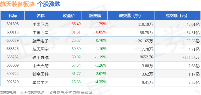 市场表现 - 1月22日,航天装备板块整体表现强劲,较上一交易日上涨5.87%,大幅跑赢大盘指数[1] - 当日上证指数上涨0.14%至4122.58点,深证成指上涨0.5%至14327.05点[1] - 板块内个股普涨,领涨股航天环宇(688523)收盘价64.44元,涨幅达8.58%[1] - 中国卫通(601698)上涨8.09%至38.75元,航天电子(600879)上涨6.20%至28.60元,中天火箭(003009)上涨3.77%至72.34元[1] 个股交易情况 - 航天环宇(688523)成交量为14.97万手,成交额为9.43亿元[1] - 中国卫通(601698)成交量达174.23万手,成交额为65.32亿元[1] - 航天电子(600879)成交量最大,为663.38万手,成交额为189.30亿元[1] - 中国卫星(600118)成交量为103.01万手,成交额为101.40亿元[1] 资金流向 - 当日航天装备板块整体呈现主力资金净流入,主力资金净流入4.31亿元,游资资金净流入2.15亿元,散户资金净流出6.45亿元[1] - 中国卫通(601698)获得主力资金净流入3.21亿元,主力净占比4.92%,同时游资净流入9579.70万元[2] - 航天环宇(688523)主力资金净流入9916.18万元,主力净占比高达10.52%,但游资和散户分别净流出1702.08万元和8214.10万元[2] - 中天火箭(003009)主力资金净流入5650.97万元,主力净占比8.70%[2] - 航天电子(600879)主力资金净流出6593.95万元,游资净流出2.27亿元,但散户资金净流入2.93亿元[2]