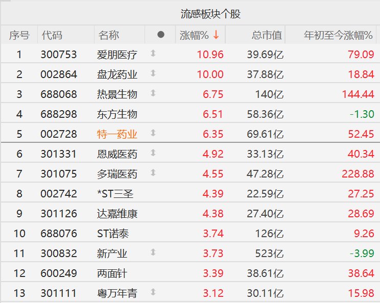 A股流感概念股继续活跃,爱朋医疗涨超10%,盘龙药业10CM涨停,热景生物、东方生物、特一药业涨超6%