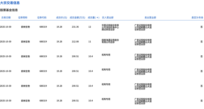 | 交易日期 | 证券简称 | 证券代码 | 成交价(元) | | 成交金额(万元) 成交量(*) 买入营业部 | | 卖出营业部 | 是否为专场 | | --- | --- | --- | --- | --- | --- | --- | --- | --- | | 2025-10-30 | 欧林生物 | 688319 | 19.28 | 231.36 | 12 | 公司深圳后海中心 | 電影東區 | 종 | | 2025-10-30 | 欧林生物 | 688319 | 19.28 | 212.08 | 11 | | | る | | 2025-10-30 | 欧林生物 | 688319 | 19.28 | 200.51 | 10.4 | 机构专用 | | 종 | | 2025-10-30 | 欧林生物 | 688319 | 19.28 | 200.51 | 10.4 | 机构专用 | 公園 2017 11:30 | 종 | | 2025-10-30 | 欧林生物 | 688319 | 19.28 | 200.51 | 10.4 | 机构专用 | | KI | | 2025-10-30 | 欧林生物 | 688 ...