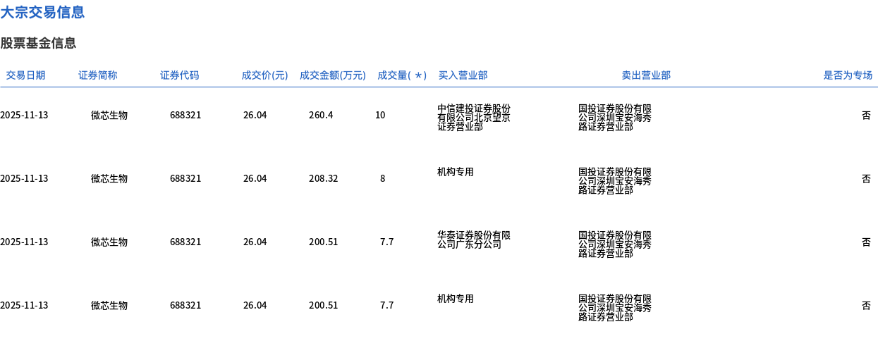 | 交易日期 | 证券简称 | 证券代码 | | | 成交价(元) 成交金额(万元) 成交量(*) 买入营业部 | | 卖出营业部 | | --- | --- | --- | --- | --- | --- | --- | --- | | 2025-11-13 | 微芯生物 | 688321 | 26.04 | 260.4 | 10 | 有限公司北京望祭 | 公司深圳章受准秀 | | 2025-11-13 | 微芯生物 | 688321 | 26.04 | 208.32 | 8 | 机构专用 | 公司深圳堂安海秀 | | 2025-11-13 | 微芯生物 | 688321 | 26.04 | 200.51 | 7.7 | 华泰证券股公营限 | 公司深圳景安温秀 | | 2025-11-13 | 微芯生物 | 688321 | 26.04 | 200.51 | 7.7 | 机构专用 | 公司深圳青年温泉 | | 交易日期 | 证券简称 | 证券代码 | | | 成交价(元) 成交金额(万元) 成交量(*) 买入营业部 | | 英出营业部 | | --- | --- | --- | --- | --- | -- ...