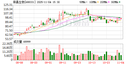 11月6日,荣昌生物盘中下跌2.00%,截至09:51,报90.16元/股,成交1.09亿元,换手率0.74%,总市值 508.15亿元。 荣昌生物所属申万行业为:医药生物-生物制品-其他生物制品。所属概念板块包括:抗癌治癌、抗癌药 物、眼科概念、生物医药、创新药等。 截至9月30日,荣昌生物股东户数1.53万,较上期增加18.33%;人均流通股10639股,较上期减少 15.54%。2025年1月-9月,荣昌生物实现营业收入17.20亿元,同比增长42.27%;归母净利润-5.51亿元, 同比增长48.60%。 机构持仓方面,截止2025年9月30日,荣昌生物十大流通股东中,香港中央结算有限公司位居第二大流 通股东,持股884.18万股,相比上期减少51.08万股。万家优选(161903)位居第三大流通股东,持股 700.00万股,相比上期增加107.55万股。工银前沿医疗股票A(001717)位居第四大流通股东,持股 400.00万股,相比上期减少49.00股。广发医疗保健股票A(004851)位居第五大流通股东,持股398.75 万股,为新进股东。汇添富创新医药混合A(006113)位居第六大流通股东, ...