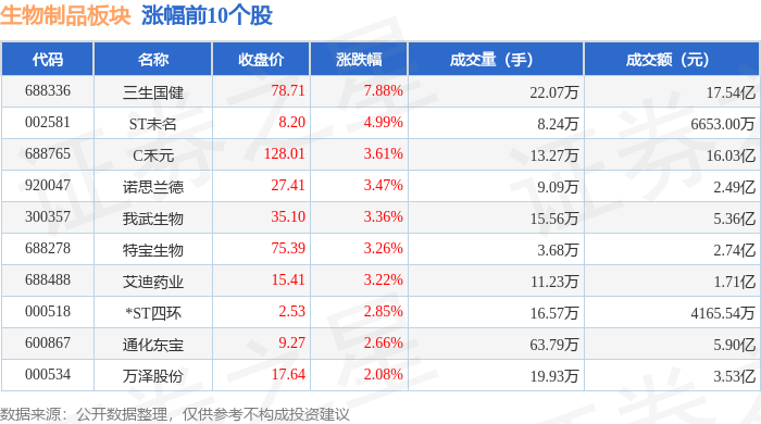 证券之星消息,11月3日生物制品板块较上一交易日下跌0.0%,欧林生物领跌。当日上证指数报收于 3976.52,上涨0.55%。深证成指报收于13404.06,上涨0.19%。生物制品板块个股涨跌见下表: | 代码 | 名称 | 收盘价 | 涨跌幅 | 成交量(手) | 成交额(元) | | | --- | --- | --- | --- | --- | --- | --- | | 688336 | 三生国健 | 78.71 | 7.88% | 22.07万 | | 17.54亿 | | 002581 | ST未名 | 8.20 | 4.99% | 8.24万 | | 6653.00万 | | 688765 | C木元 | 128.01 | 3.61% | 13.27万 | | 16.03亿 | | 920047 | 诺思兰德 | 27.41 | 3.47% | 9.09万 | | 2.49亿 | | 300357 | 我武生物 | 35.10 | 3.36% | 15.56万 | | 5.36亿 | | 688278 | 特宝生物 | 75.39 | 3.26% | 3.68万 | | 2.74亿 | | ...