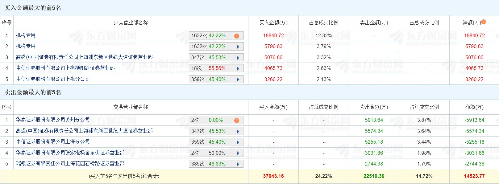 | 序号 | 交易营业部名称 | | | 买入金额(万) | 占总成交比例 | | --- | --- | --- | --- | --- | --- | | 1 | 华泰证券股份有限公司苏州分公司 | 2次 0.00% | 3 | | | | 2 | 高盛(中国)证券有限责任公司上海浦东新区世纪大道证券营业部 | 347次 45.53% | | | | | 3 | 中信证券股份有限公司上海分公司 | 359次 45.40% | | | | | 4 | 华泰证券股份有限公司张家港杨舍东街证券营业部 | 2次 50.00% | | | | | 5 | 瑞银证券有限责任公司上海花园石桥路证券营业部 | 385次 48.83% | | | | | | (买入前5名与卖出前5名)总合计: | | | 37043.16 | 24.22% | 华盛锂电(688353.SH)今日涨19.16%,换手率17.88%,成交额15.29亿元。龙虎榜数据显示,两家机构位列买一、买二席位,买入2.46亿元;游资"孙哥"位列 买四席位,买入4066万元。上榜席位全天买入3.7亿元,卖出2.25亿元,合计净买入1.45亿元。(格隆汇) ...