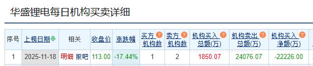 华盛锂电龙虎榜:机构净卖出2.22亿元
