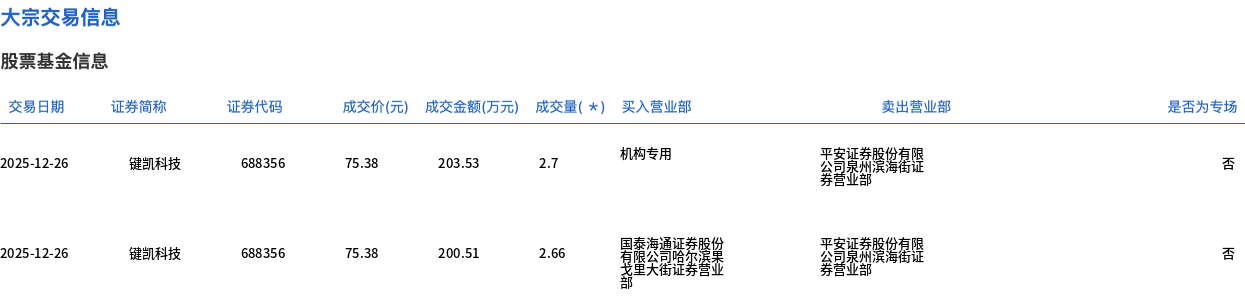| 交易日期 | 证券简称 | 证券代码 | 成交价(元) | 成交金额(万元) 成交量( * ) 买入营业部 | | | 卖出营业部 | | --- | --- | --- | --- | --- | --- | --- | --- | | 2025-12-26 | 键凯科技 | ୧୫୫३२୧ | 75.38 | 203.53 | 2.7 | 机构专用 | 案臺亦設 交息資料送清星遊 | | 2025-12-26 | 键凯科技 | 688356 | 75.38 | 200.51 | 2.66 | 国泰海通证券股份 有限公司哈尔滨里 | 案高小説 交自資州送選擇選 士圣正登降 | 12月26日,键凯科技大宗交易成交5.36万股,成交额404.04万元,占当日总成交额的16.48%,成交价75.38元,较市场收盘价81.96元折价8.03%。 ...