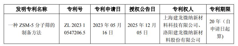 | 发明专利名称 | 专利号 | 专利申请日 | 授权公告日 | 专利权) | 专利期限 | | --- | --- | --- | --- | --- | --- | | 一种 ZSM-5 分子筛的 | ZL 2023 1 | 2023 年 05 月 | 2025年12月 | 上海建龙微纳新材 料科技有限公司、 | 20年(自 | | 制备方法 | 0547206.5 | 10日 | 05 日 | 洛阳建龙微纳新材 | 申请日起 算) | | | | | | 料股份有限公司 | | 格隆汇12月16日丨建龙微纳(688357.SH)公布,洛阳建龙微纳新材料股份有限公司(以下简称"公司")于近日收到了1 项中 华人民共和国国家知识产权局颁发的授权发明专利证书,具体如下: ...