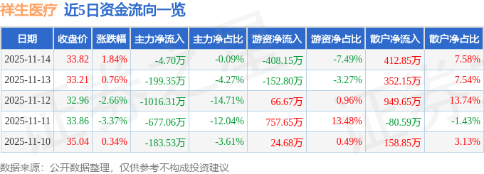 证券之星消息,截至2025年11月14日收盘,祥生医疗(688358)报收于33.82元,上涨1.84%,换手率 1.43%,成交量1.6万手,成交额5446.46万元。 11月14日的资金流向数据方面,主力资金净流出4.7万元,占总成交额0.09%,游资资金净流出408.15万 元,占总成交额7.49%,散户资金净流入412.85万元,占总成交额7.58%。 | | | | 日期 收盘价 涨跌幅 主力净流入 主力净占比 游资净流入 游资净占比 散户净占比 | | | | | | --- | --- | --- | --- | --- | --- | --- | --- | | 2025-11-14 | 33.82 1.84% | -4.70万 | -0.09% | -408.15万 | -7.49% | 412.85万 | 7.58% | | 2025-11-13 | 33.21 0.76% | -199.35万 | -4.27% | -152.80万 | -3.27% | 352.15万 | 7.54% | | 2025-11-12 | 32.96 -2.66% | -1016.31万 | -14.71% ...