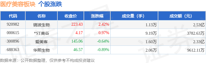 证券之星消息,12月1日医疗美容板块较上一交易日上涨0.08%,爱美客领涨。当日上证指数报收于 3914.01,上涨0.65%。深证成指报收于13146.72,上涨1.25%。医疗美容板块个股涨跌见下表: 从资金流向上来看,当日医疗美容板块主力资金净流出1575.4万元,游资资金净流出792.18万元,散户 资金净流入2367.58万元。医疗美容板块个股资金流向见下表: 以上内容为证券之星据公开信息整理,由AI算法生成(网信算备310104345710301240019号),不构成 投资建议。 | 代码 | 名称 | 收盘价 | 涨跌幅 | 成交量(手) | 成交额(元) | | | --- | --- | --- | --- | --- | --- | --- | | 300896 | 爱美客 | 146.00 | 0.43% | 1.99万 | | 2.89亿 | | 920982 | 锦波生物 | 218.15 | 0.41% | 4509.52 | | 9826.37万 | | 688363 | 华熙生物 | 66.99 | 0.00% | 2.63万 | | 1.24亿 | | 000615 | * ...