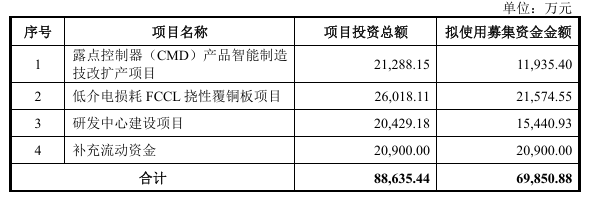 融资概况 - 公司向特定对象发行股票的申请于10月14日获得上海证券交易所受理 [1] - 本次拟发行股票数量不超过2730.00万股 [1] - 预计募集资金总额为6.99亿元 [1] - 本次发行的保荐机构为国泰海通证券股份有限公司 [1] 募集资金用途 - 募集资金将用于四个项目:露点控制器产品智能制造技改扩产项目、低介电损耗FCCL挠性覆铜板项目、研发中心建设项目及补充流动资金 [1] - 项目投资总额合计为8.86亿元,拟使用募集资金金额合计为6.99亿元 [1] - 露点控制器项目投资总额为2.13亿元,拟使用募集资金1.19亿元 [1] - 低介电损耗FCCL挠性覆铜板项目投资总额为2.60亿元,拟使用募集资金2.16亿元 [1] - 研发中心建设项目投资总额为2.04亿元,拟使用募集资金1544.09万元 [1] - 补充流动资金项目拟使用募集资金2.09亿元 [1]