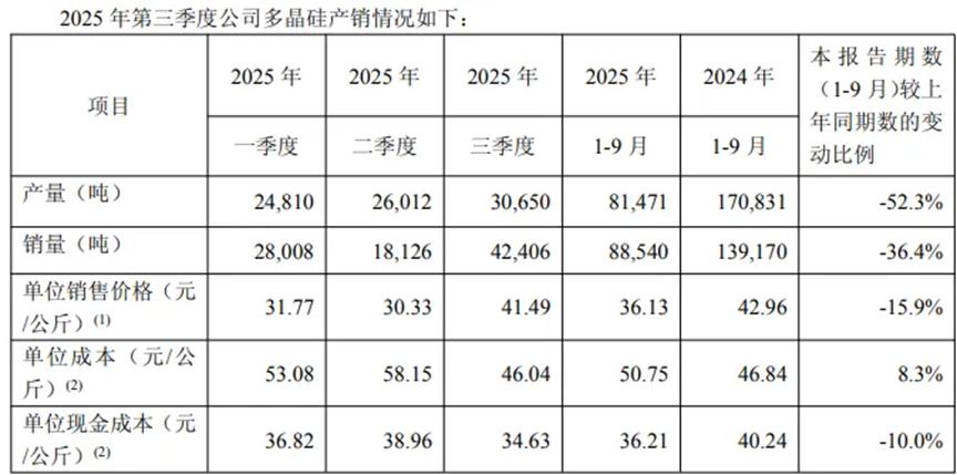 "轻舟已过万重山"。看完光伏三季报后,终于可以大声吟唱出这首诗句了,顿感轻松了不少。 协鑫科技第三季度光伏材料业务利润约为9.6亿元(其中包括出售一家联营公司产生的税后出售收益约6.4亿元),与去年同 期公司光伏材料业务亏损约18.1亿元;通威股份第三季度同环比大幅扭亏;大全能源三季度盈利了7300万。 硅料企业的利润好转最为明显,受益于行业自律,不低于成本价销售,三季度硅料行业量价齐升,期货价格更是从二季度 最低3万/吨疯涨至5.8万/吨。 | 项目 | 2025年 | 2025 年 | 2025 年 | 2025 年 | 2024 年 | 本报告期数 (1-9月)较上 | | --- | --- | --- | --- | --- | --- | --- | | | | | | | | 年同期数的变 | | | 一季度 | 二季度 | 三季度 | 1-9 月 | 1-9 月 | 动比例 | | 产量(吨) | 24,810 | 26,012 | 30.650 | 81,471 | 170,831 | -52.3% | | 销量(吨) | 28,008 | 18,126 | 42.406 | 88,540 ...