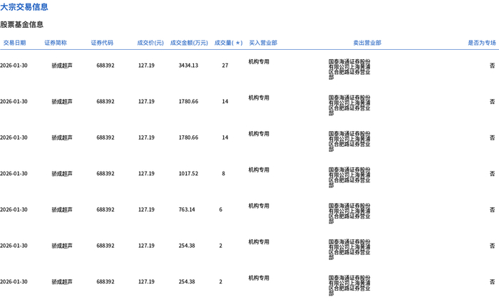 大宗交易概况 - 2026年1月30日,骄成超声发生大宗交易,总成交量73万股,总成交额9284.87万元,占该股当日总成交额的16.92% [1] - 该笔大宗交易的成交价格为127.19元,较当日市场收盘价135.31元折价6% [1] 交易明细分析 - 当日大宗交易由多笔分交易构成,成交价格均为127.19元 [2] - 交易明细显示,所有交易的买入营业部均为“机构专用” [2] - 分笔交易成交金额分别为3434.13万元、1780.66万元、1780.66万元、1017.52万元、763.14万元、254.38万元和254.38万元,对应成交量分别为27万股、14万股、14万股、8万股、6万股、2万股和2万股 [2]