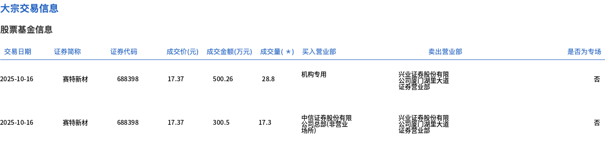 10月16日,赛特新材大宗交易成交46.1万股,成交额800.76万元,占当日总成交额的17.9%,成交价17.37元,较市场收盘价19.94元折价12.89%。 | 交易日期 | 证券简称 | 证券代码 | 成交价(元) | 成交金额(万元) 成交量( * ) 买入营业部 | | | | 卖出营业部 | | --- | --- | --- | --- | --- | --- | --- | --- | --- | | 2025-10-16 | 赛特新材 | 688398 | 17.37 | 500.26 | 28.8 | 机构专用 | 兴业证券股份有 公司厦门湖重关覆 | | | 2025-10-16 | 赛特新材 | 688398 | 17.37 | 中信证券股份有限 公司总部(菲营业 300.5 | 17.3 | 功PT) | 兴业证券股份有限 公司厦门湖重关遇 证券营业部 | | ...