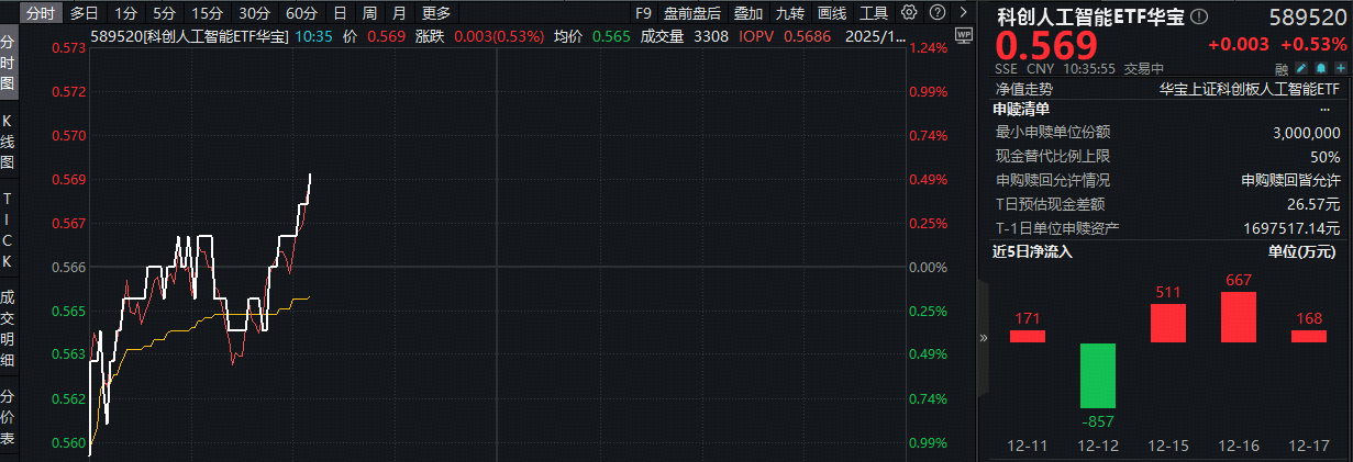 ETF盘中资讯 | 字节大会来袭,利好AI应用!字节产业链含量33%的科创人工智能ETF(589520)逆市活跃,近3日吸金1346万元