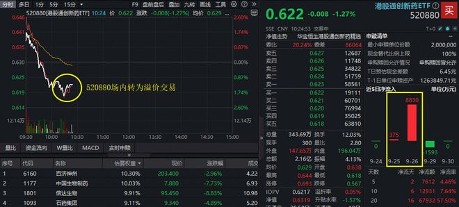 (来源:医疗ETF) 10月9日,港股医药突发重挫,恒生生物科技指数低开低走,盘中一度跌超5%。港股通创新药板块跌势 更甚,港股通创新药ETF(520880)标的指数恒生港股通创新药精选指数最低下探6.14%,诺诚健华、 科伦博泰生物-B跌超10%,权重股中国生物制药跌超7%,信达生物跌超8%。 "十一"假期期间,全球权益资产普涨,港股通创新药板块亦有表现,上周(9月29日-10月3日),恒生 港股通创新药精选指数单周累涨6.54%,得益于此,A股今日开市,港股通创新药ETF(520880)高开 1.75%后走低,现跌逾1%,盘中转为溢价交易,反映低吸资金或渐占上风。 来源:市场资讯 港股通创新药ETF(520880)基金经理丰晨成指出,目前创新药投资已经进入alpha阶段,选股因子开始 大于beta,市场会逐步回归真正有临床价值且能真实兑现业绩的龙头品种。创新药板块短期的市场调 整,反而可能给真正质优的创新药企业提供了一次难得的买点。 【创新药"新势力"——港股通创新药ETF(520880):不含CXO,纯正创新药,港股高弹性】 港股通创新药ETF(520880)是全市场首只跟踪恒生港股通创新药精选指数的E ...