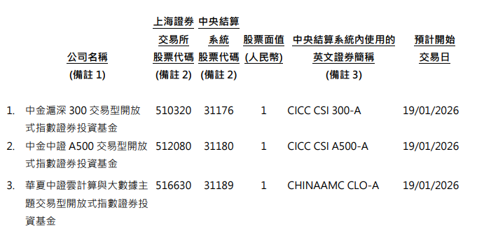1月14日,港交所发布公告称,沪深300ETF中金(510320)、A500ETF中金(512080)等共53只基金和中力 股份(603194.SH)、联芸科技(688449.SH)等共计4只股票获纳入沪股通名单,自由现金流ETF(159201)、 创业板ETF东财(159205)等共43只基金和海安集团(001233.SZ)、中国铀业(001280.SZ)共3只股票获纳入 深股通。以上变动2026年1月19日生效。 相关调整信息如下: 沪股通: | 上海證券 中央結算 | | | | | | --- | --- | --- | --- | --- | | 交易所 | 系統 | | 股票面值 中央結算系統內使用的 | 預計開始 | | 公司名稱 股票代碼 股票代碼 (人民幣) | | | 英文證券簡稱 | 交易日 | | (備註 1) (備註 2) (備註 2) | | | (備註 3) | | | 24. 招商中證銀行 AH 價格優選 517900 31192 | | | 1 CN MERCHANTS-A | 19/01/2026 | | 交易型開放式指數證券投資 | | | | | | 基金 | | | ...