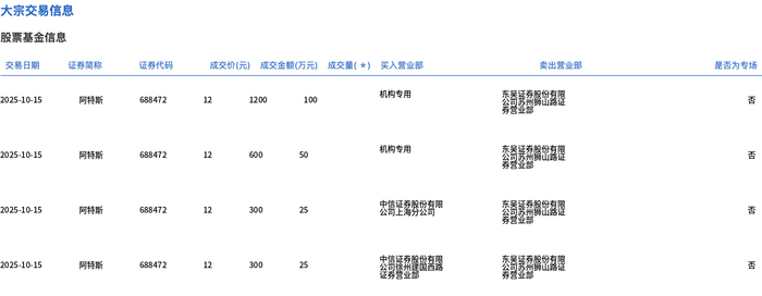 | 交易日期 | 证券調核 | 证券代码 | | | 成交价(元) 成交金额(万元) 成交量(*) 买入营业部 | | 类出雪变程 | 是否为专场 | | --- | --- | --- | --- | --- | --- | --- | --- | --- | | 2025-10-15 | 阿特斯 | 688472 | 12 | 1200 | 100 | 机构专用 | 茶量生态做出盆糖 | 彩 | | 2025-10-15 | 阿特斯 | 688472 | 12 | 600 | 50 | 机构专用 | | Ka | | 2025-10-15 | 阿特斯 | 688472 | 12 | 300 | 25 | 公司正常的公司 | . | 18 | | 2025-10-15 | 阿特斯 | 688472 | 12 | 300 | ર્ટ | 容量量量量器 | 11 1 1 1 1 | Ka | 10月15日,阿特斯大宗交易成交200万股,成交额2400万元,占当日总成交额的1.5%,成交价12元,较 市场收盘价13.64元折价12.02%。 ...