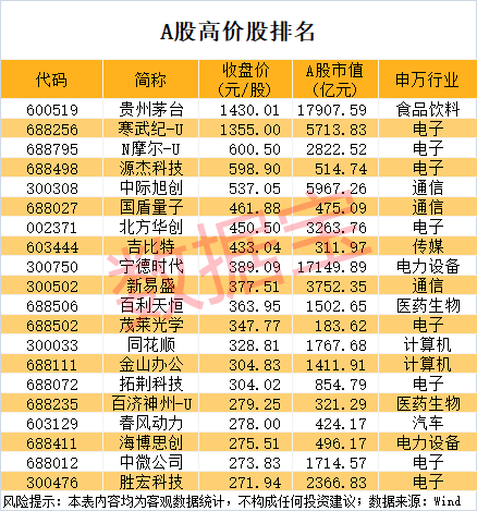 摩尔线程科创板上市表现 - 摩尔线程于12月5日登陆科创板,股票代码688795 [1] - 该股开盘涨幅高达468.8% [1] - 收盘报600.5元/股,成为A股第三高价股,取代了源杰科技的位置 [1] 上市首日市值表现 - 公司A股市值在开盘后直接飙升至3000亿元以上 [1] - 截至收盘,公司A股市值为2822.52亿元 [2] A股高价股排名情况 - 当前A股第一高价股为贵州茅台,收盘价1430.01元/股,市值17907.59亿元 [2] - 当前A股第二高价股为寒武纪-U,收盘价1355.00元/股,市值5713.83亿元 [2] - 摩尔线程以600.50元/股收盘价位列第三 [2] - 被取代的源杰科技收盘价为598.90元/股,市值514.74亿元,位列第四 [2] 高价股行业分布 - 排名前20的高价股中,电子行业公司数量最多,包括寒武纪-U、摩尔线程、源杰科技、北方华创、茂莱光学等 [2] - 通信行业有中际旭创、国盾量子、新易盛三家公司上榜 [2] - 计算机行业有同花顺和金山办公两家公司上榜 [2] - 电力设备行业有宁德时代和海博思创两家公司上榜 [2] - 医药生物、汽车、传媒等行业各有1家公司上榜 [2]