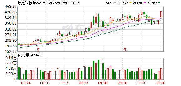 资金面上,源杰科技上一交易日主力资金净流入1171.62万元,近5日净流出2.34亿元。 融资融券数据显示,该股最新(10月17日)两融余额为6.31亿元,其中,融资余额为6.29亿元,较上一 个交易日增加9.24万元,增幅为0.01%;融券余额为184.56万元,较上一个交易日减少31.21万元,降幅 为14.46%。近10日两融余额合计减少9046.91万元,降幅为12.54%,其间融资余额下降12.47%,融券余 额下降30.27%。 从机构评级来看,近一个月该股获1家机构买入评级。10月16日太平洋证券发布的研报给予公司买入评 级。(数据宝) 10月20日盘中科创板股源杰科技涨停,截至10:05,股价报433.92元,成交15.26亿元,换手率6.17%,振 幅11.15%。 科创板个股中,截至发稿上涨的共有551只,涨幅在10%以上的共有7只,涨幅较高的有源杰科技、珠海 冠宇、华盛锂电等,分别上涨20.00%、17.54%、16.52%,下跌的有34只,跌幅较大的有复洁环保、科 思科技、热景生物,分别下跌10.75%、3.65%、3.23%。 ...