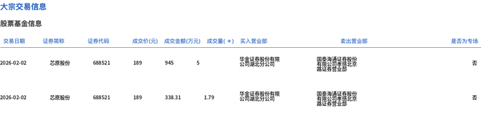 大宗交易概况 - 2026年2月2日,芯原股份发生一笔大宗交易,成交量为6.79万股,成交额为1283.31万元,占当日总成交额的0.34% [1] - 该笔大宗交易的成交价格为189元/股,较市场收盘价207.85元/股折价9.07% [1] 交易明细数据 - 根据交易明细表,芯原股份(证券代码:688521)在2026年2月2日的大宗交易成交价为189元,成交金额为338.31万元,成交量为1.79万股 [2] - 交易明细中同时列出了另一笔证券简称显示为“念慶最好”但证券代码同为688521的交易,成交价为189元,成交金额为945万元,成交量为5万股 [2]