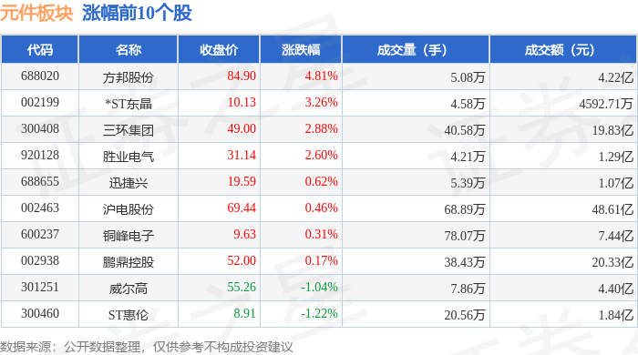 证券之星消息,1月13日元件板块较上一交易日下跌2.44%,高华科技领跌。当日上证指数报收于 4138.76,下跌0.64%。深证成指报收于14169.4,下跌1.37%。元件板块个股涨跌见下表: 从资金流向上来看,当日元件板块主力资金净流出53.02亿元,游资资金净流入13.83亿元,散户资金净流 入39.2亿元。元件板块个股资金流向见下表: | 代码 | 名称 | 主力净流入(元) | 主力净占比 游资净流入(元) | | 游资净占比 散户净流入 (元) | | 散户净占比 | | --- | --- | --- | --- | --- | --- | --- | --- | | 301251 | 威尔高 | -4657.75万 | 10.59% | 2228.17万 | 5.06% | -6885.92万 | -15.65% | | 688020 | 方邦股份 | 3872.96万 | 9.19% | -1614.49万 | -3.83% | -2258.47万 | -5.36% | | 002938 鵬鼎控股 | | 1851.68万 | 0.91% | -1655.01万 | -0.81% | -1 ...