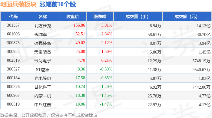 从资金流向上来看,当日地面兵装板块主力资金净流出6950.25万元,游资资金净流入6211.89万元,散户 资金净流入738.37万元。地面兵装板块个股资金流向见下表: 证券之星消息,11月4日地面兵装板块较上一交易日下跌0.22%,国科军工领跌。当日上证指数报收于 3960.19,下跌0.41%。深证成指报收于13175.22,下跌1.71%。地面兵装板块个股涨跌见下表: | 代码 | 名称 | 收盘价 | 涨跌幅 | 成交量(手) | 成交额(元) | | | --- | --- | --- | --- | --- | --- | --- | | 301357 | 北方长龙 | 156.86 | 3.01% | 8.94万 | | 14.13亿 | | 601606 | 长城军工 | 52.51 | 2.34% | 58.61万 | | 30.70亿 | | 300875 | 捷强装备 | 49.02 | 2.12% | 0 8.07万 | | 3.94亿 | | 300922 | 天奏装备 | 25.00 | 1.50% | 5.86万 | | 1.45亿 | | 002519 | 银河电子 | 4.7 ...