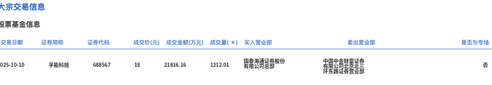 | 反崇垫五十层 | | | | | | | | | --- | --- | --- | --- | --- | --- | --- | --- | | 交易日期 | 证券商称 | 证券代码 | 成交价(元) 成交金额(万元) 成交量( *) 买入营业部 | | | 卖出营业部 | 是否为专场 | | 025-10-10 | 孚能科技 | 688567 | 18 21816.16 | 1212.01 | 国泰海湾运营股份 | 親親影 | ка | 10月10日,孚能科技大宗交易成交1212.01万股,成交额2.18亿元,占当日总成交额的16.54%,成交价 18元,较市场收盘价18.4元折价2.17%。 ...
