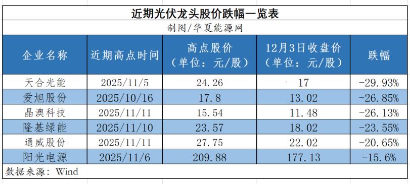 看好光伏行业困境反转的投资者们,近期要被光伏股的持续大跌"砸"懵了。 自11月上旬起,光伏板块上市公司多次出现集体大跌。其中11月21日,超120只个股下跌,光伏板块指数跌幅高 达-5.75%。截至今日(12月3日),通达信光伏设备指数已跌至499.24点,相比11月11日的592.03点高点跌了15.7%。 12月3日,光伏板块再度整体萎靡,76只光伏股飘绿。截至收盘,光伏设备指数下跌1.17%。其中,国晟科技 (SH:603778)、双良节能(SH:600481)、爱旭股份(SH:600732)跌幅均超过3%;晶科能源(SH:688223)、晶澳科技 (SZ:002459)、天合光能(SH:688599)、中来股份(SZ:300393)等跌幅均超过2%。 这与年中以来光伏板块的集体上涨形成鲜明对比。原本在政策反内卷和硅料收储两大利好支撑下,光伏股走出了触底回 升的良好走势:到9月5日,已有多只光伏股较4月初翻倍;到10月9日,A股光伏设备板块年内实现上涨23.1%。然而, 大好形势已经不在了。 光伏产业链的情况也不乐观。硅料价格自9月下旬以来已连续9周未上涨,硅片和电池片则自10月中下旬以来连续下降, 以 ...