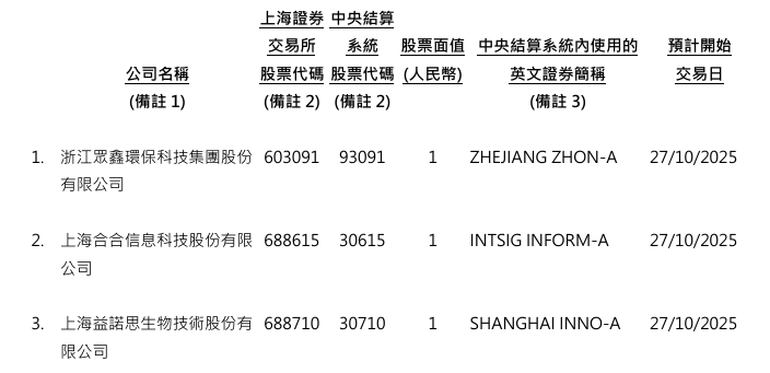 智通财经APP获悉,根据香港中央结算有限公司10月22日公告,众鑫股份(603091.SH)、合合信息 (688615.SH)、益诺思(688710.SH)将于10月27日起在"沪港股票交易机制"("沪港通")下进行交易,并将会 在同日被纳入成为中央结算系统合资格证券。该中华通证券的买卖会根据香港结算一般规则及香港结算 运作程序规则在中央结算系统的持续净额交收制度下以人民币进行结算及交收。香港结算将不会就中华 通证券提供实物股票记存及提取服务。 | 上海證券 中央結算 | | | | | | --- | --- | --- | --- | --- | | 交易所 | 系統 | 股票面值 | 中央結算系統內使用的 | 預計開始 | | 公司名稱 | 股票代碼 股票代碼 (人民幣) | | 英文證券簡稱 | 交易日 | | (備註 1) (備註 2) (備註 2) | | | (備註 3) | | | 浙江眾鑫環保科技集團股份 603091 93091 | | 1 | ZHEJIANG ZHON-A | 27/10/2025 | | 有限公司 | | | | | | 上海合合信息科技股份有限 688615 306 ...