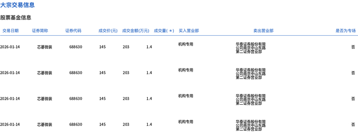 1月14日,芯碁微装大宗交易成交51万股,成交额7395万元,占当日总成交额的4.35%,成交价145元, 较市场收盘价164.01元折价11.59%。 大宗交易信息 股票基金信息 | 交易日期 | 证券商标 | 证券代码 | | | 成交价(元) 成交金额(万元) 成交量(*) 买入营业部 | | 类出管业部 | 是否为专场 | | --- | --- | --- | --- | --- | --- | --- | --- | --- | | 2026-01-14 | 芯基微装 | 688630 | 145 | 1450 | 10 | | | KA | | 2026-01-14 | 宗教师餐 | 688630 | 145 | 797.5 | 5.5 | | | KA | | 2026-01-14 | 芯基层装 | 688630 | 145 | 725 | 5 | | | Ka | | 2026-01-14 | 芯基礎装 | 688630 | I45 | 435 | 3 | | | 影 | | 2026-01-14 | 空报道路 | 688630 | 145 | 420.5 | 2.9 | 机构专用 | An ...